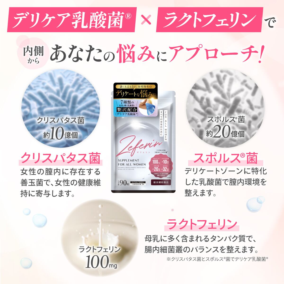 Zeferin ゼフェリン 90粒 30日分×3袋 女性特有のお悩みに 7種の乳酸菌を贅沢配合 フェムケアサプリ デリケアサプリ デリケア乳酸菌 膣活® ラクトフェリン クリスパタス菌 スポルス菌 LB-GH4 EC-12 葉酸 腸溶性 デリケートなお悩みに おりもの 臭い | ファインアップ